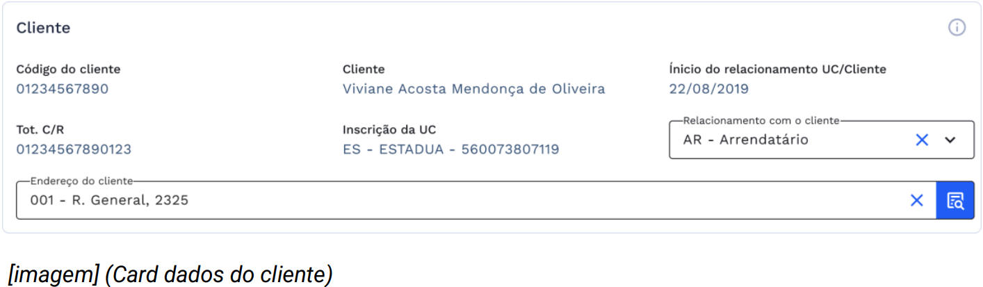 Nesta etapa contamos com os dados do cliente vinculado a unidade consumidora. Dessa forma possuímos dados como: número do código do cliente, nome completo, número do Tot. C/R, número da inscrição da UC, data do inicio do relacionamento UC/Cliente em modo consultivo. Já os campos de relacionamento com o cliente e endereço estão disponíveis para alteração cadastral.