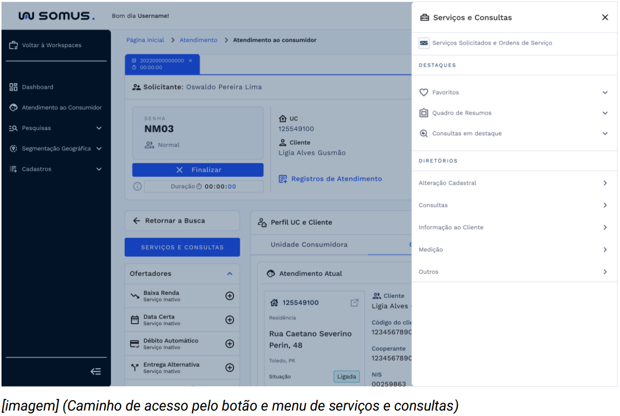 Para ter acesso a alteração cadastrais, clique no botão de serviços e consultas disponibilizado no perfil da UC, assim será exibido o menu principal contendo os diretórios e serviços disponíveis.