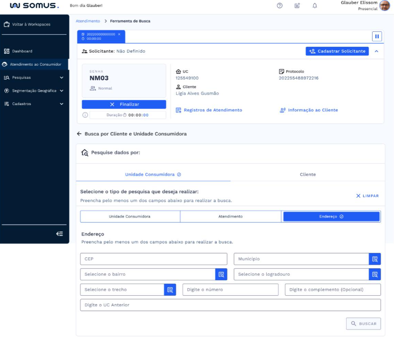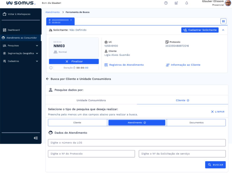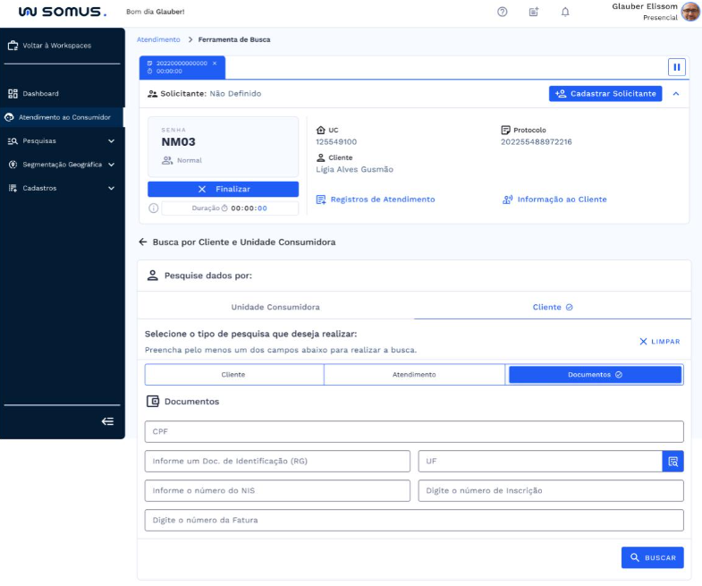 Após o atendimento ser iniciado, a ferramenta de busca por Cliente ou Unidade Consumidora será habilitada abaixo da barra de atendimento. Onde será possível realizar pesquisa por:
